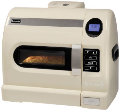 The Bready BMCS01 Robot Fully-Automatic Baking System is a technologically advanced robotic baking system designed in Sweden. The machine and specially formulated mixes work together to produce fresh hot bakery-quality wheat and gluten-free baked goods. Each mix has its own unique RFID smart tag. Simply scan and attach the mix bag add a few simple ingredients and press a button. All the parameters for kneading resting rising and baking are automatically entered for perfect results every time. Bready makes a wide variety of breads cakes and doughs. All mixing and kneading occurs inside the mix bag so theres no mess; just discard the empty bag at the end of the baking cycle. Unlike a traditional bread machine theres no paddle so the loaves have no hole in the bottom. Breadys unique vertical kneading imitates the hand-kneading of a professional baker enabling liquids to fully penetrate the dry ingredients resulting in perfectly textured doughs that are moist and wont crumble under a knife. And because Bready mixes come pre-sealed to bake in a closed environment risk of cross-contamination is eliminated or greatly reduced. Bready is the fresh solution for people who love bread but cant tolerate gluten. Patented Baking System makes fresh hot and delicious wheat or gluten-free breads cakes and doughs in your own kitchen. No mixing no guesswork no mess no shopping for ingredients. Greatly reduces risk of cross-contamination for gluten intolerant or sensitive people. Just scan bag attach bag to the machine add liquids and yeast push start and go. Mixes and kneads the dough inside the bag then transfers the dough to the loaf pan where it rises and bakes. Unique vertical kneading insures liquids penetrate dry mix for a softer moister baked product that stays fresh longer. Squeezable doughs for pizza crusts sandwich buns muffins breadsticks and more. Clean-up is simple: remove empty mix bag and wipe with a damp paper towel. PTFE-free ceramic non-stick loaf pan releases breads easily. Automatic steam injection for chewier wheat bread crusts. 11 varieties of gluten-free mixes available. 9 varieties of wheat mixes available. Includes 4 mixes 2 12 pizza pans jumbo burger bun pan and instruction book.